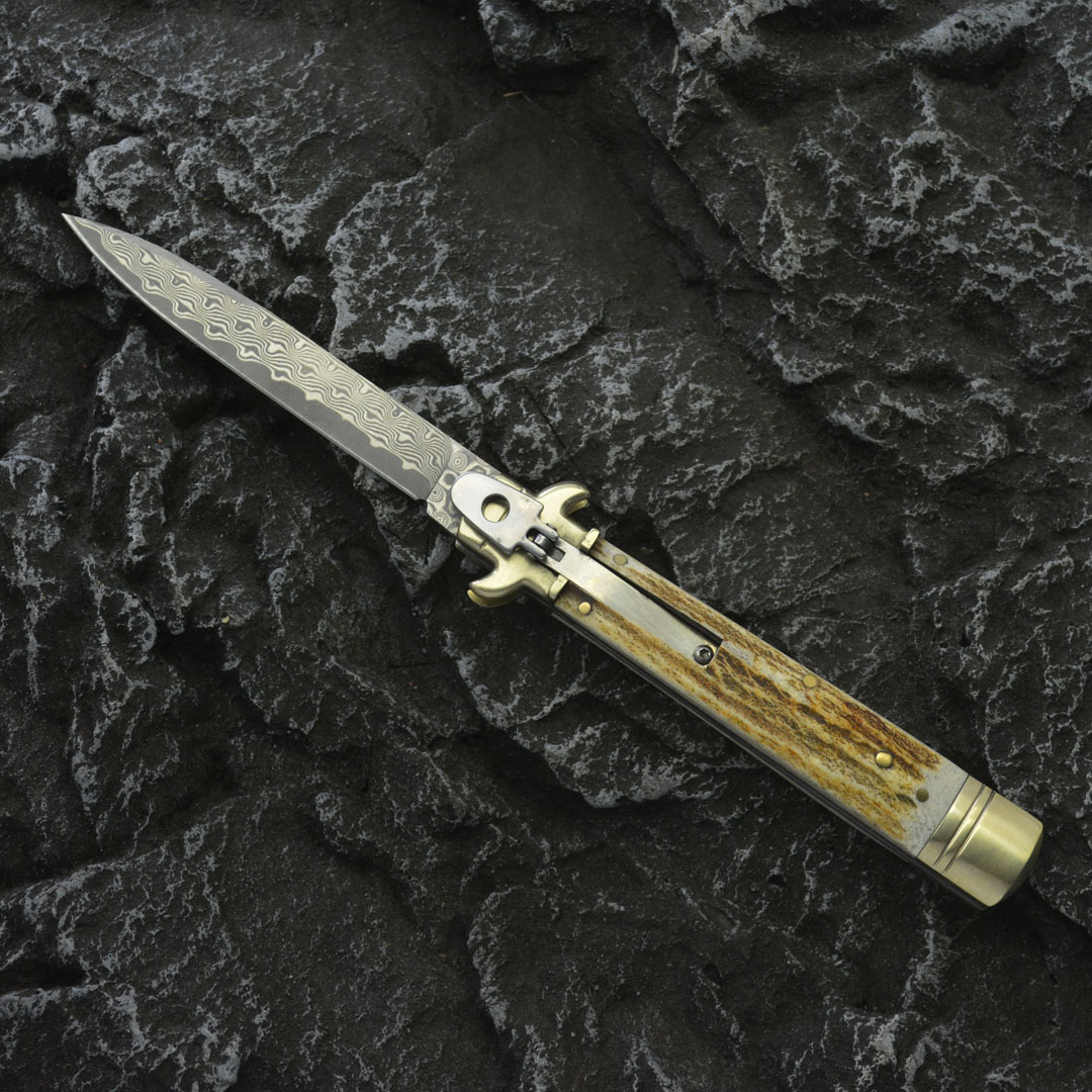 Plus+款(9英寸) 正品意大利Akc 古典跳刀鹿角柄leverletto 到货,AKC2025新款,经典的杠杆纽扣锁定,弹簧快速打开刀刃,大马士革刃,搭配天然角和铜护手,手工精细抛磨,Plus+新款,数控精磨刃,线条明晰,刃口锋利,经典意大利风格,非常适合收藏
