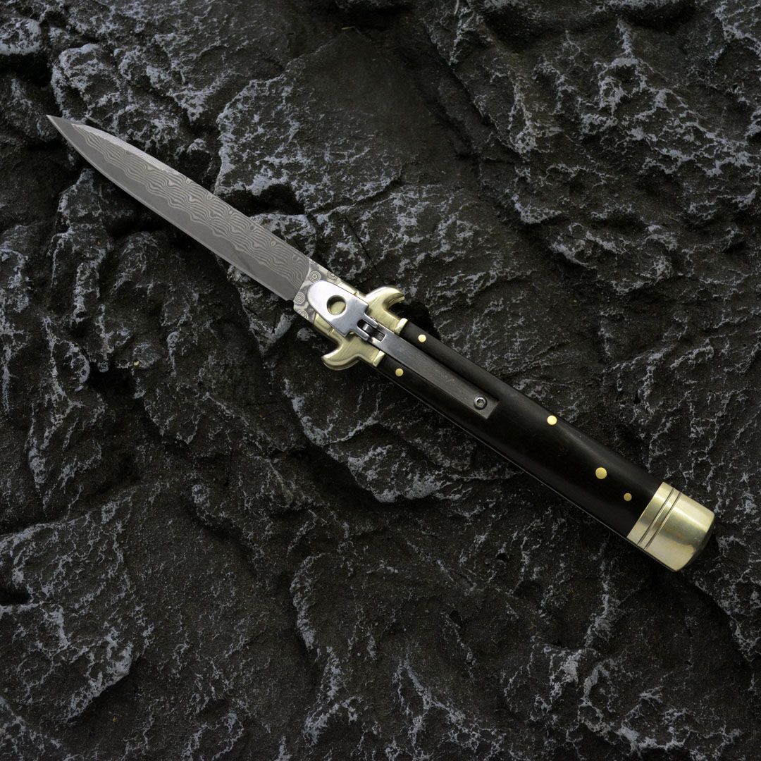 Plus+款(9英寸) 正品意大利Akc 古典跳刀鹿角柄leverletto 到货,AKC2025新款,经典的杠杆纽扣锁定,弹簧快速打开刀刃,大马士革刃,搭配天然角和铜护手,手工精细抛磨,Plus+新款,数控精磨刃,线条明晰,刃口锋利,经典意大利风格,非常适合收藏